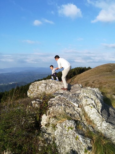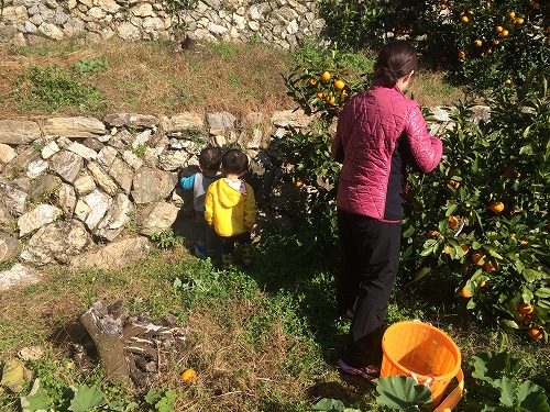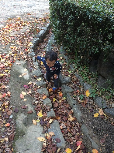 2018/11/25 みかん狩り。石垣を登ろうとする1歳半とそれをみて「すごいねぇ」と感心する2歳半の図