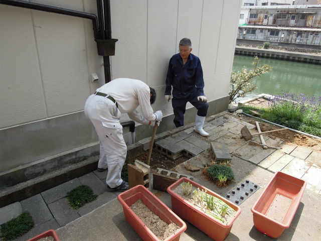 事務所の裏で何故かブロックを掘り起こしている社長&三木さんの図