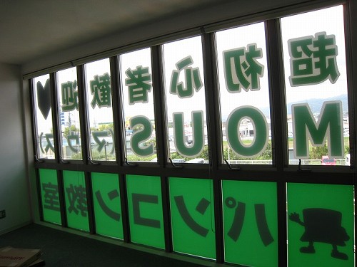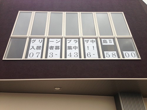 図:2階部分の看板イメージに、A3用紙をそのまま並べて貼っただけの貧相な貼紙・・・