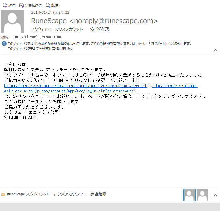 これまた怪しいアドレスでスクウェア・エニックスを名乗るメール