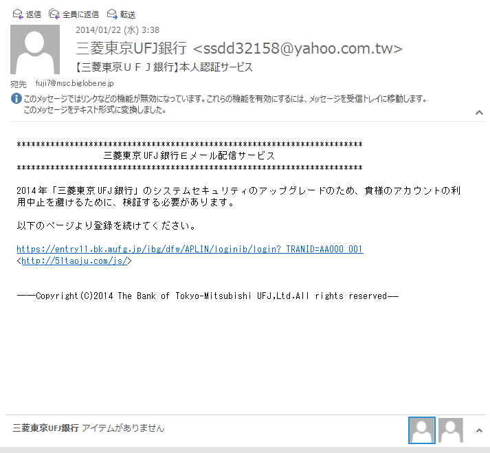 あやしいアドレスで三菱東京UFJ銀行を名乗るメールと・・・