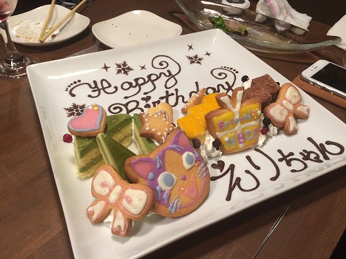 (お店に了解を取った上で、クッキーを友人の奥さんが自作し、ケーキと共に盛り付けてもらってサプライズ!!)